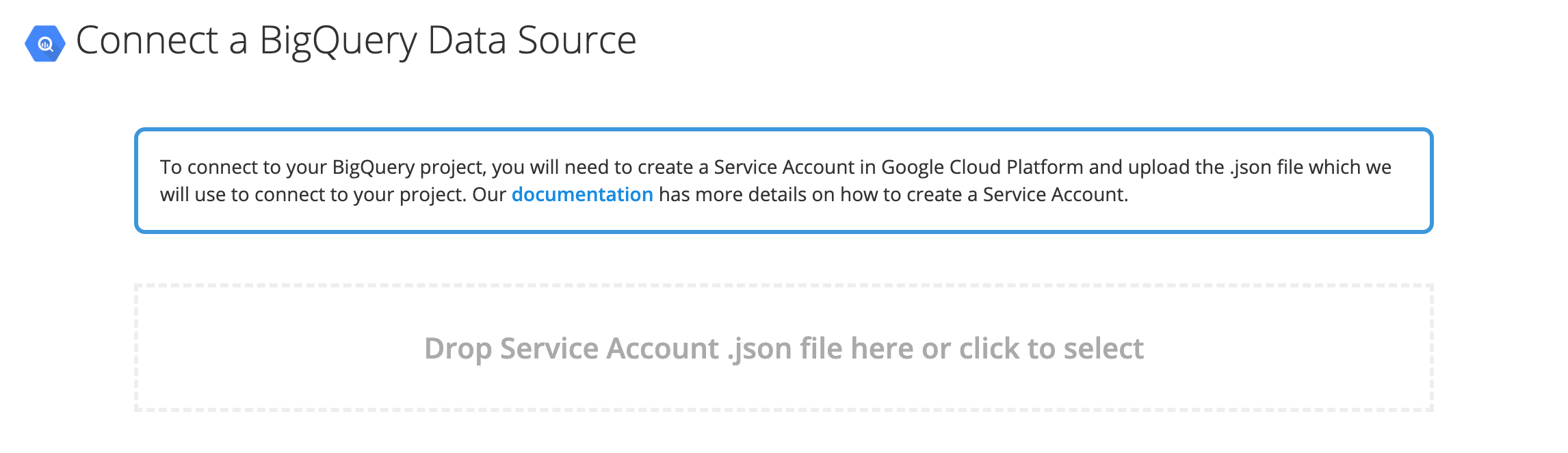 2. Upload the JSON key file that you downloaded from Step 1. (Note: It may take a few minutes for Google to accept the JSON key. If you get an error uploading the JSON file to Chartio, wait a few minutes and try again.)