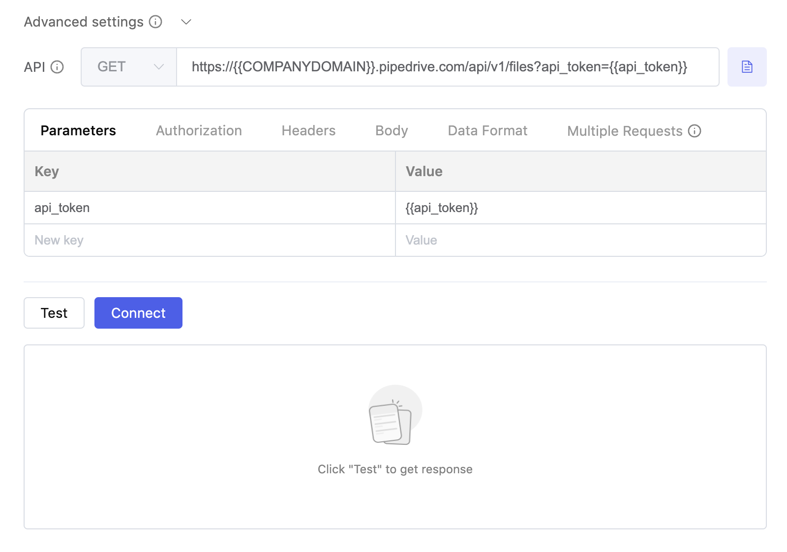 An API template resource configuration interface usually contains two sections, a form for default parameters and an "Advanced Settings" option for further customizations.