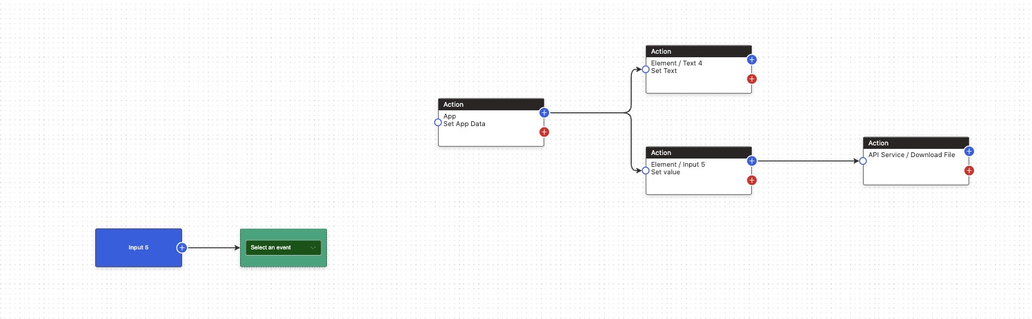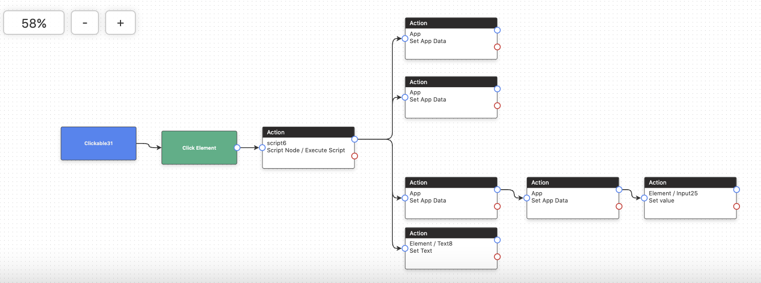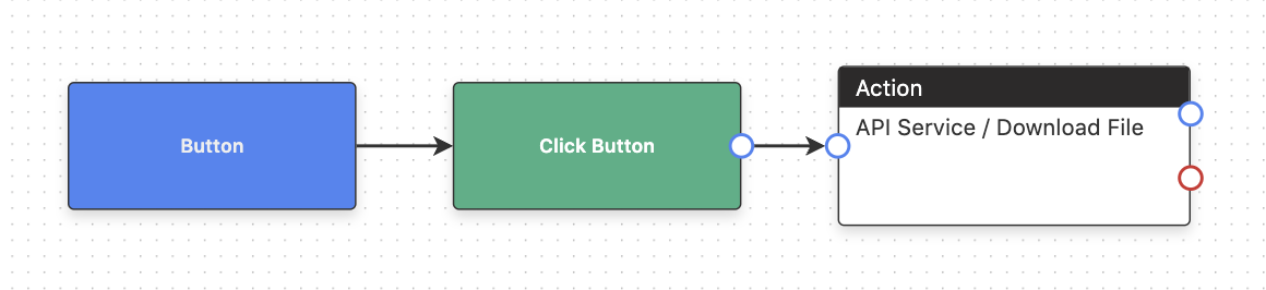 The blue block represents the page, element, or data node that you are editing. Green blocks  represent a supported <mark style="color:green;">**event**</mark> that will trigger the action. Lastly, the **action** block contains the action that will be performed.