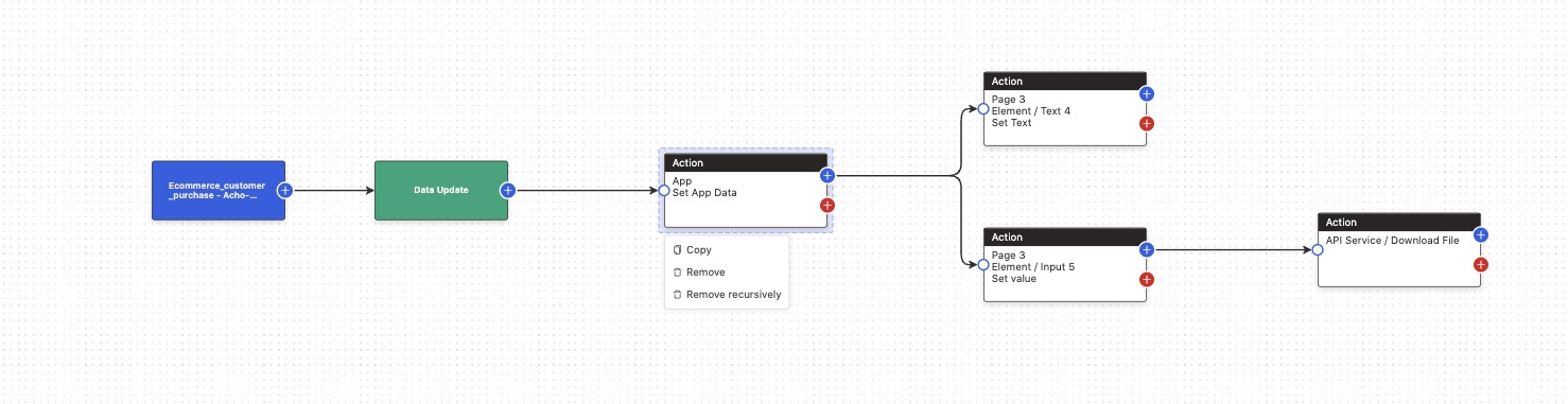Select an action and press `ctrl + c` (`cmd + c`  on Mac) or click the copy menu below action to copy (e.g. the first Set App Data action).&#x20;