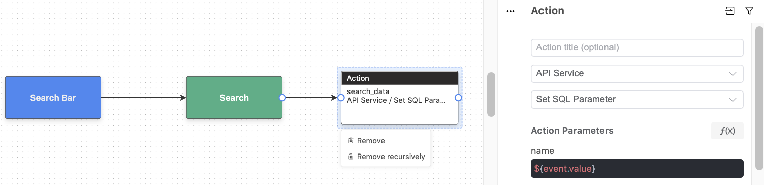 Use the search event to create an interaction on the search bar to set the SQL parameter in your **Query**. In the action parameters, use `${event.value}` to access the user's search value.