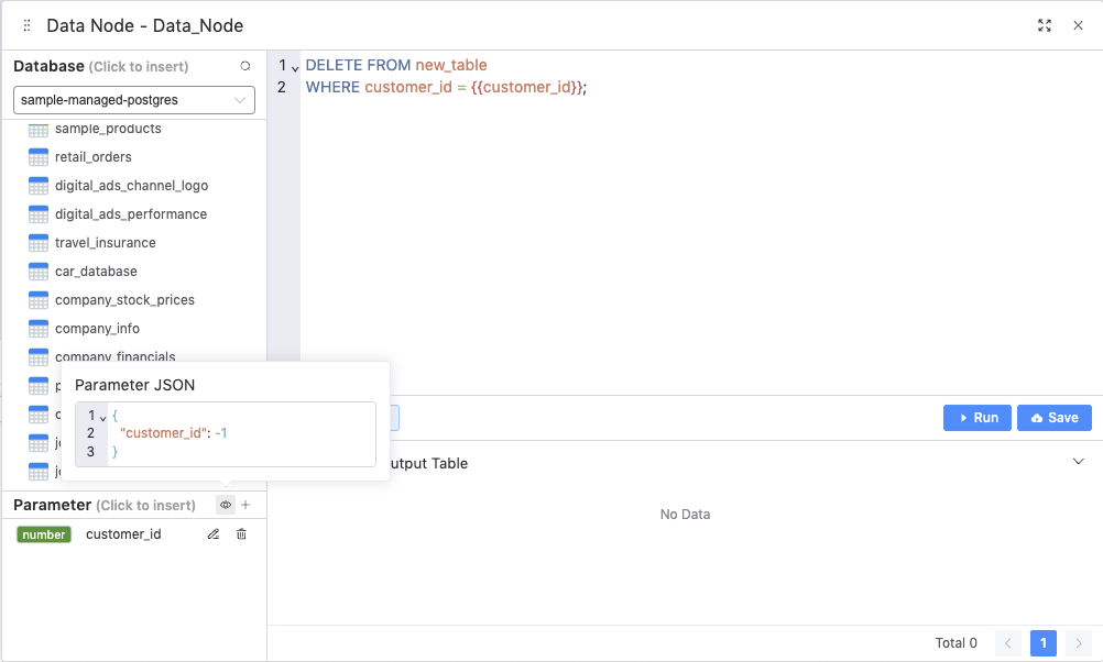 On the button, add an interaction to set the SQL parameter of the data node to the `customer_id` of that row. Use `${$row.customer_id}` to access the value.&#x20;