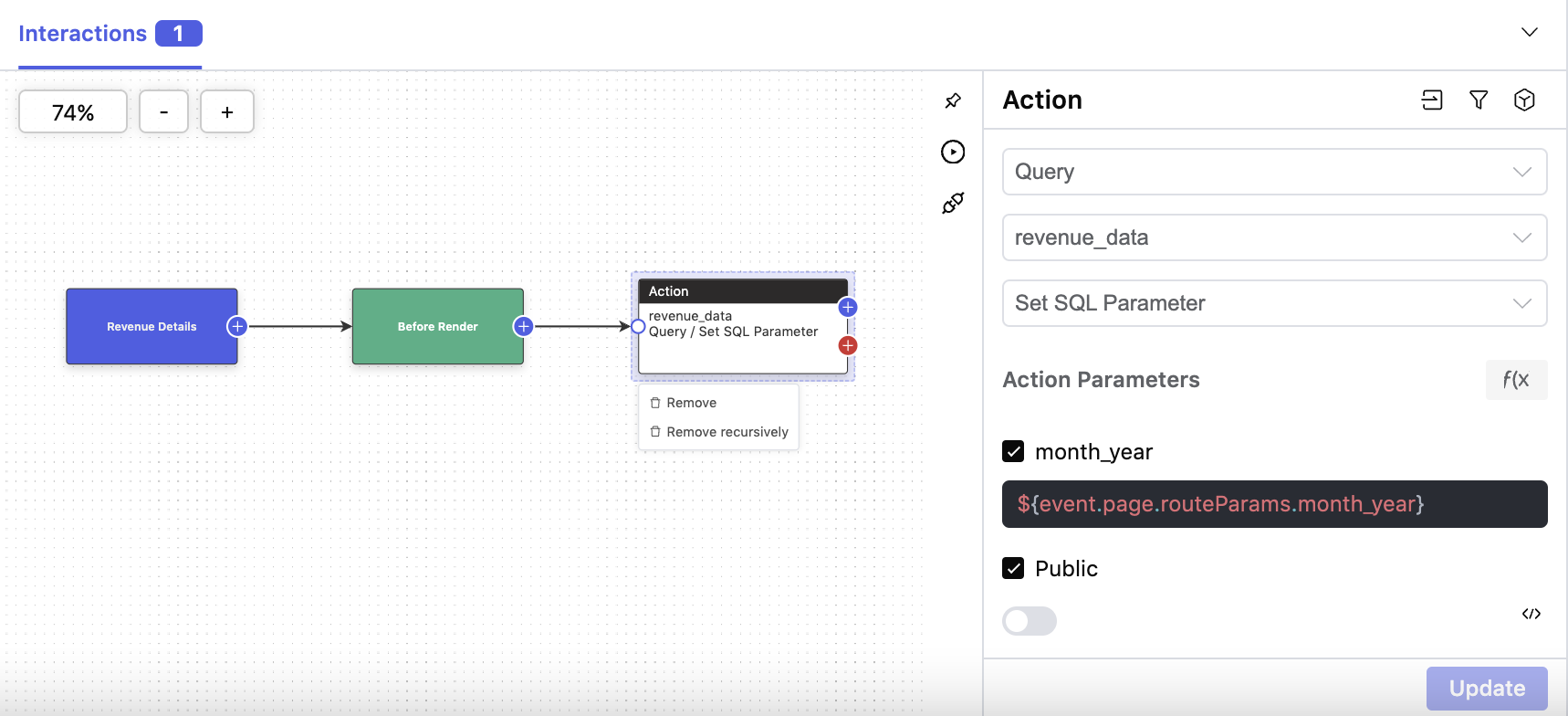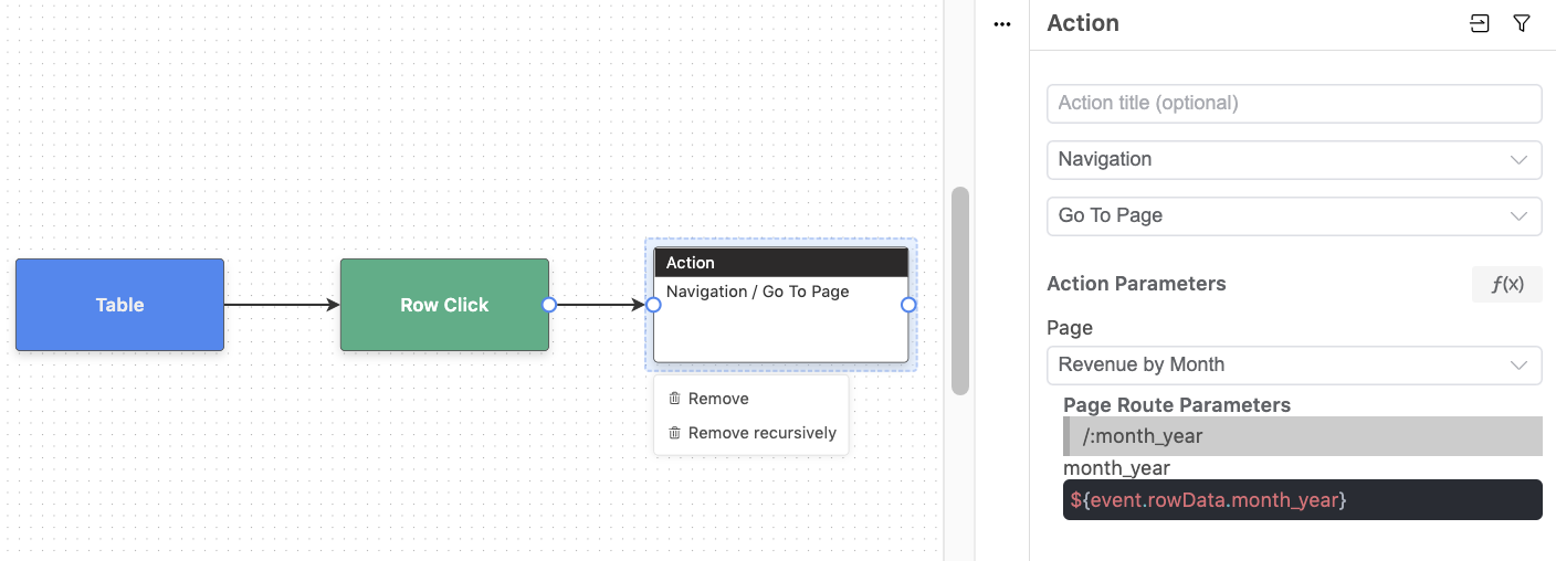 This example is set up on a table, and we're passing in the `month_year` value for the selected row using `${event.rowData.month_year}`.